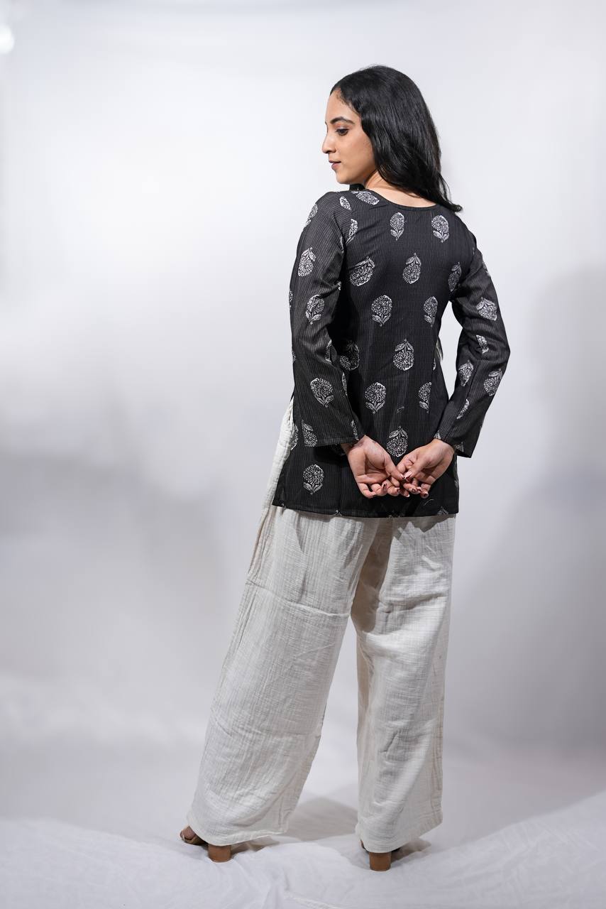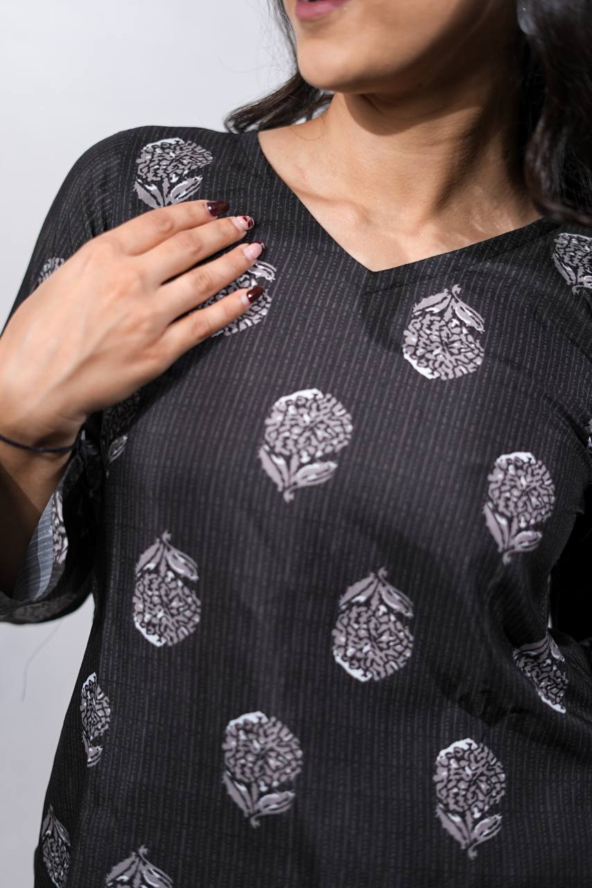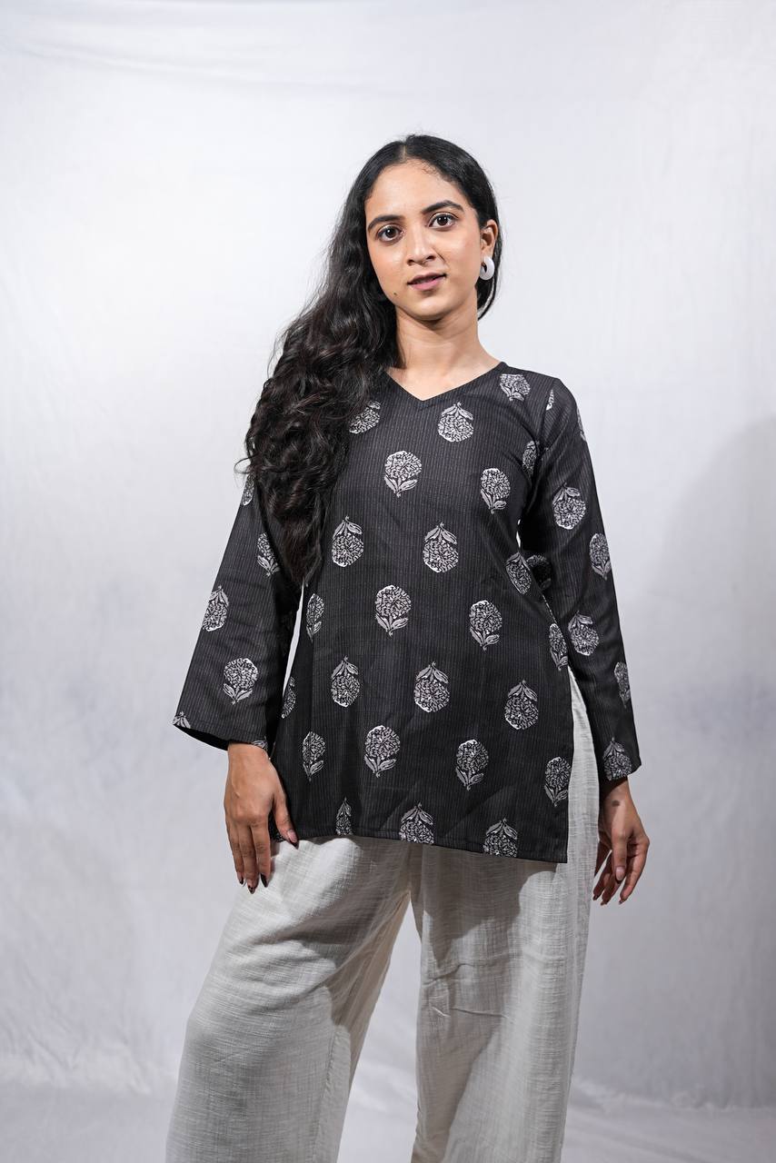 Elevate your everyday ethnic wardrobe with Amiee black blossom full sleeved kurti, featuring intricate white floral motifs. The kurti has a relaxed, straight fit with full sleeves and a subtle V-neckline that adds a touch of sophistication. Crafted from breathable cotton fabric, it offers comfort and style in equal measure and making it a timeless addition to your ethnic and fusion wardrobe.