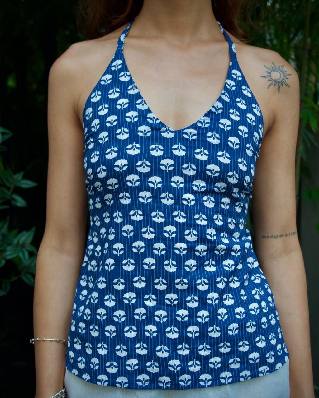 The Amira Blue Blossom Halter neck Top, a stunning piece handcrafted for the free-spirited soul. Featuring delicate handblock-printed white floral motifs set against a cool indigo-blue, this halter top is a breezy blend of comfort and charm.