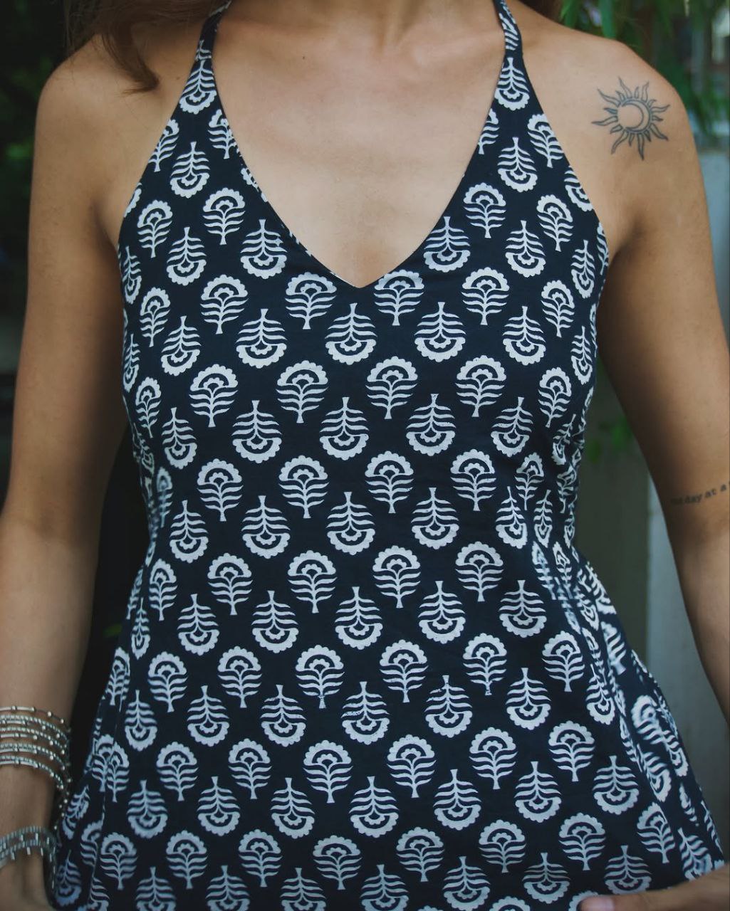 Effortlessly elegant and rooted in tradition, the Gul Halter neck Top is your perfect blend of heritage and modern style. Handcrafted with care, this top features intricate white floral block prints against a deep black backdrop, reminiscent of moonlit garden blooms. The flattering halter neckline and soft, breathable fabric make it ideal for everything from sun-drenched strolls to starlit gatherings.