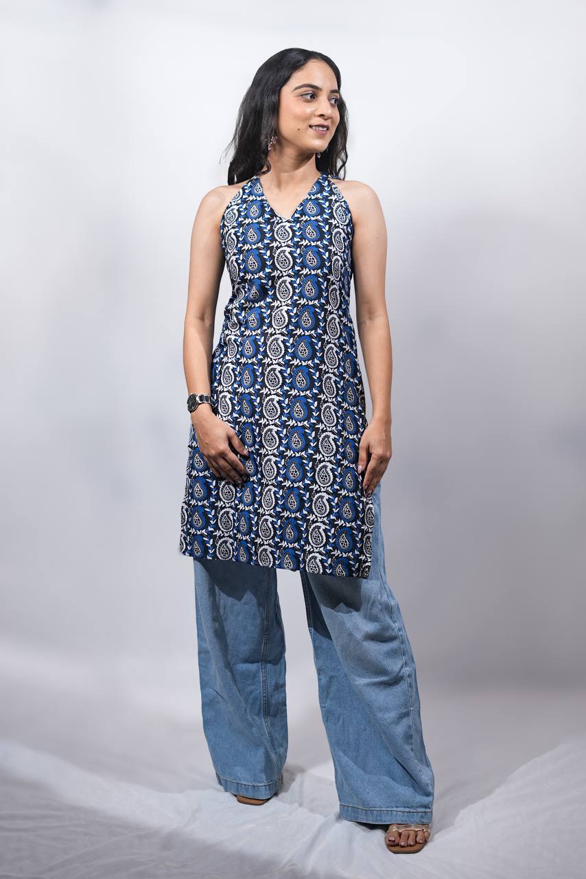 Our Jamuna sleeveless long kurti, a modern silhouette wrapped in timeless hand-block printed charm. Whether you're heading to brunch, a casual office day, or an art fair, this long kurti effortlessly adds a touch of contemporary grace to your wardrobe.