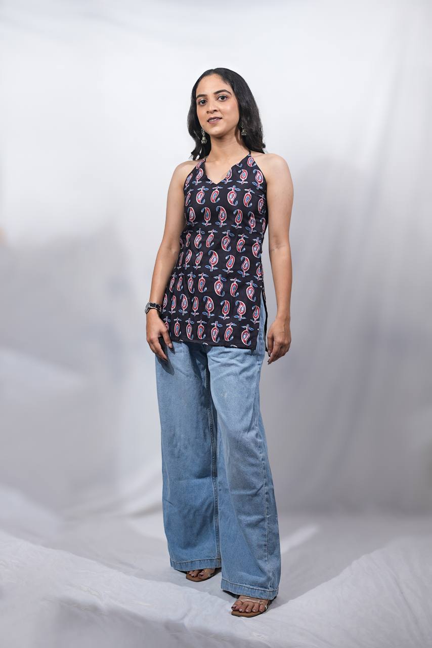 A stylish sleeveless Juna halter-neck top. Designed with a flattering V-neckline and an eye-catching paisley-handblock print, this top offers a perfect blend of comfort and fashion. This top is crafted from pure cotton and features an authentic block print design, a timeless art form that is especially renowned in Jaipur.