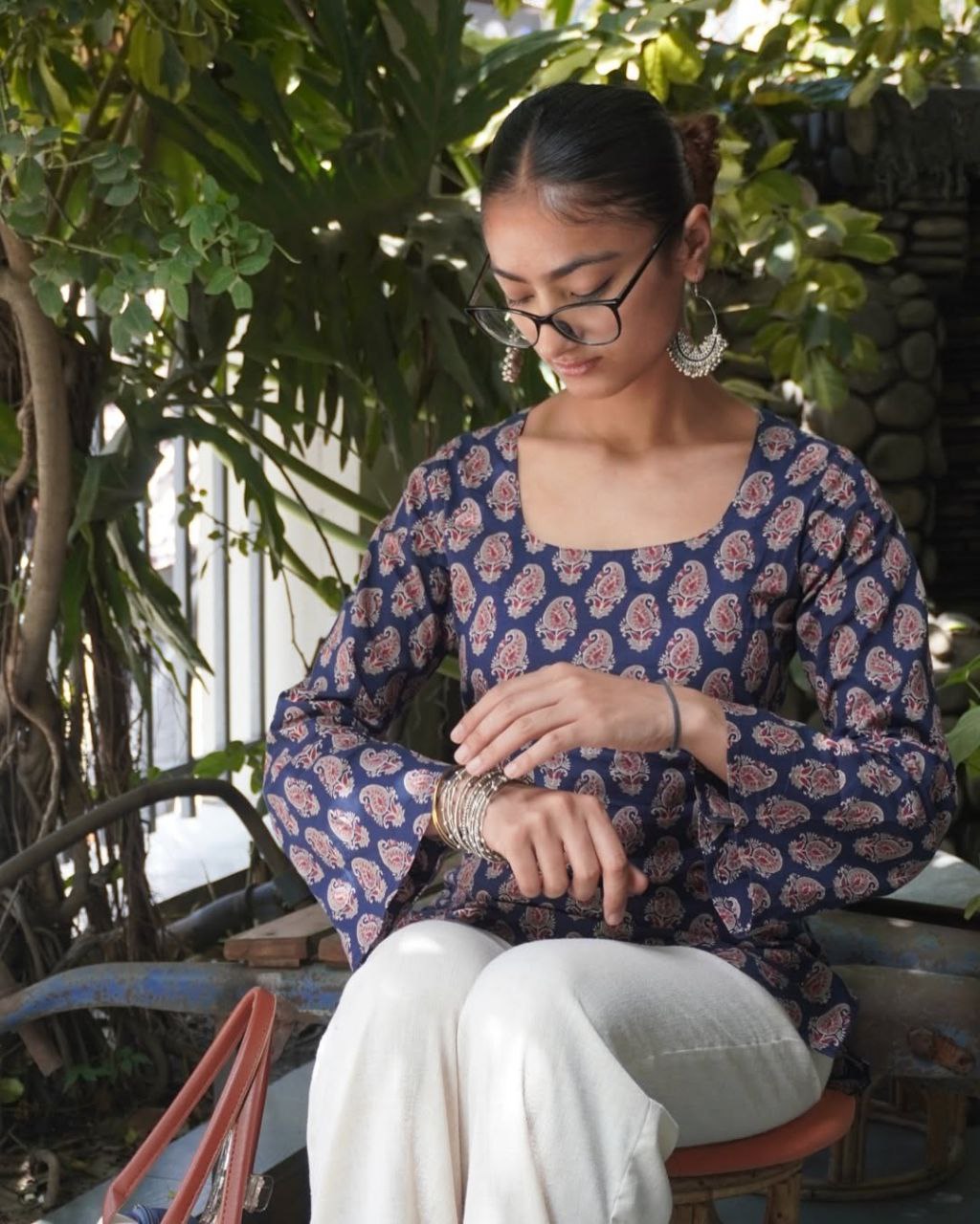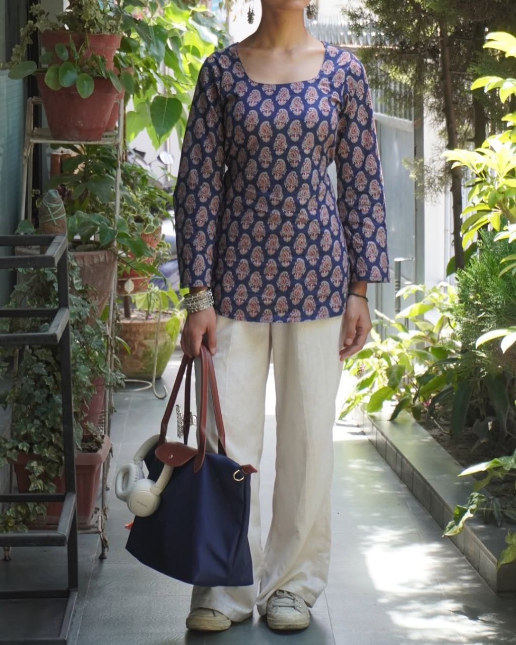 Khushi deep back sleeved kurti with a traditional paisley motif in earthy tones is hand-block printed as part of the ensemble. The Khushi kurti, which is made of soft, breathable cotton, is perfect for daily wear because it has a straight hem that falls just below the hips, full sleeves, and a flattering scoop neckline.