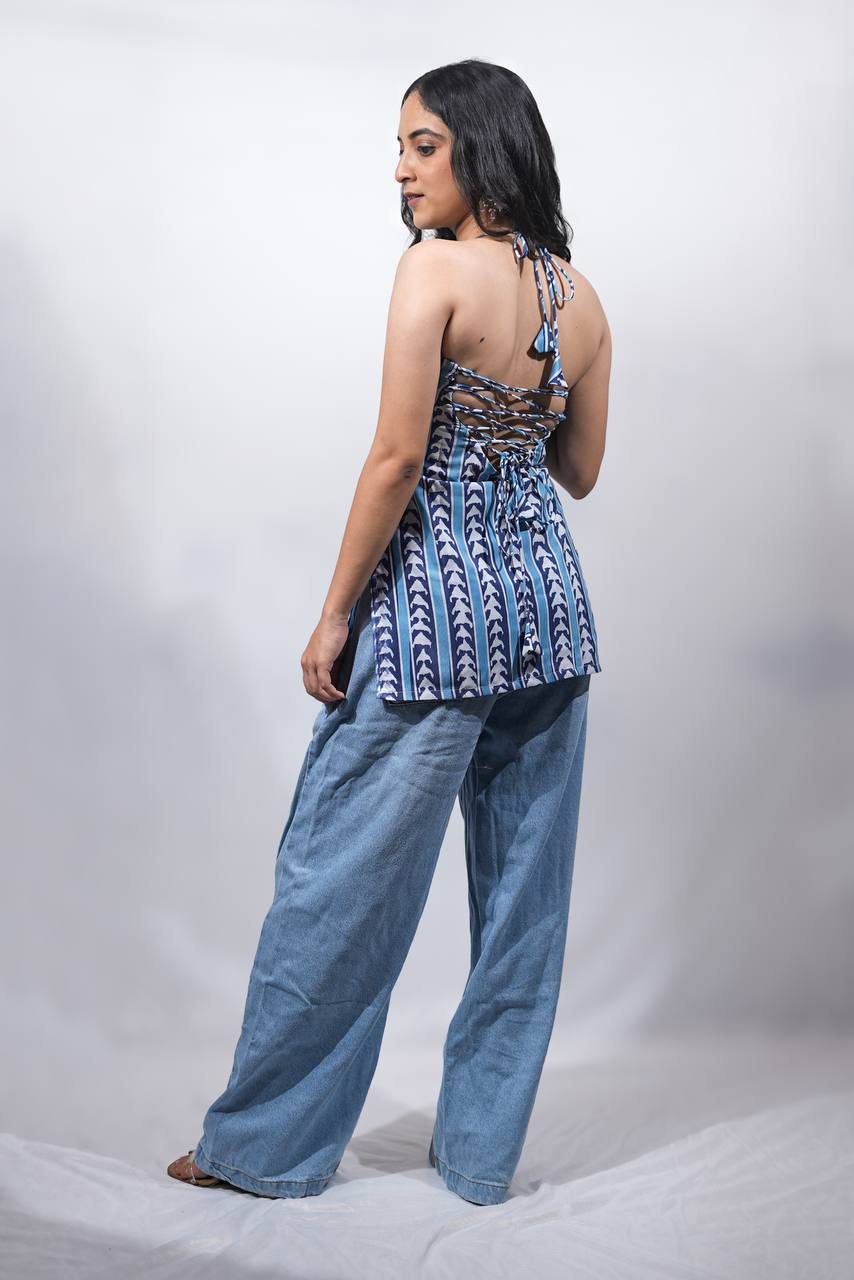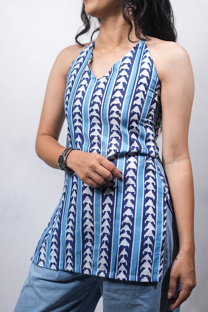 The Ruhi Halter Neck Kurti is a modern take on tradition. This piece, which is made of soft, breathable cotton, has arrow motifs handblock printed in calming indigo tones, signifying bold direction, freedom, and movement. Your go-to option for sunny days, music festivals, art walks, or weekend brunches is the halter neckline, which adds an edgy vibe while keeping everything cool and casual.