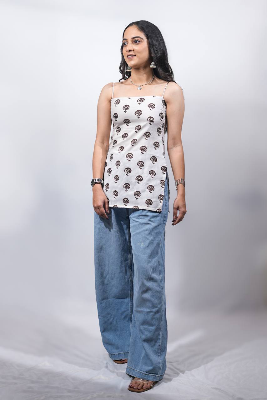 Met, the Selin Spaghetti Strap Kurti is a perfect blend of comfort and contemporary design. Made from breathable cotton, this ivory-white kurti is adorned with hand block-style tree motifs in deep brown, evoking a calm, earthy vibe.